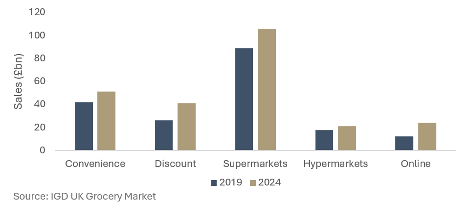 Over the last five years, the supermarket channel has remained the most dominant sales channel in the UK grocery market, accounting for approximately 12% of the total market, demonstrating a permanent shift in consumer behaviours following the pandemic. Omnichannel supermarkets remain mission critical for the fulfilment of online sales due to their proximity to customers, existing supply chain infrastructure and the full product ranges that these stores carry to maximise product availability for online orders.